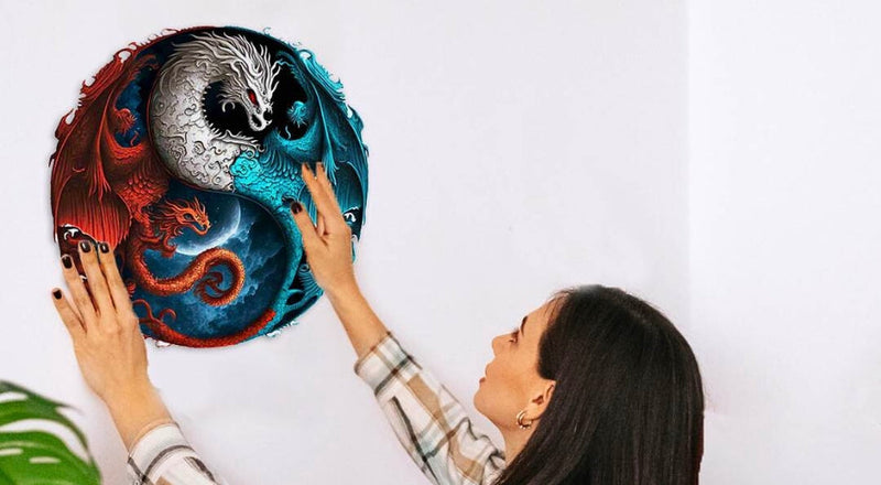 Wenn Sie das Yin Yang-Puzzle zusammensetzen, werden Sie Teile in Form von Wildtieren entdecken: Kaninchen, Katze, Vogel, Hund, usw.